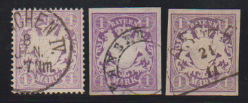 1 Mk. violett, dunkelviolett, sowie gezähnt mit Randwasserzeichen (selten), drei gestempelte Kabinettstücke, sign. Sem bzw. Schmitt und Nr. 31a Fotoexp. Sem. Mi. 450,- +