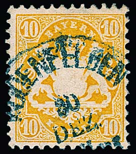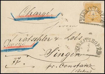 10 Kr. dunkelgelb, gutes Wasserzeichen tadellos, einzeln auf Chargé-Briefvs. (Marke zur Prüfung gelöst und mit Falz replatziert) aus Nürnberg, Fotoexp. Brettl. Mi. lose 500,- (Brief EF 1800,-)