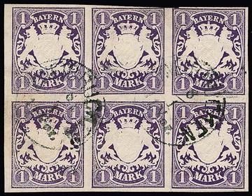 1 Mk. violett, meist breitrandiger Sechserblock (oben bei zwei Marken "Lupenrand") mit K1 "Zweibrücken", teils kl. Beanstandungen, sign. Schmitt