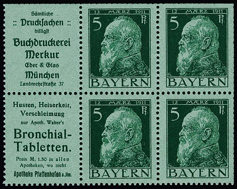 5 Pfg. Luitpold, Heftchenblatt 2.3 (Reklamen "Buchdruckerei Merkur" und "Bronchial-Tabletten") ungebraucht, Mi. 380,-