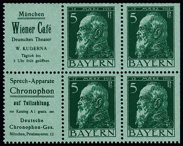 5 Pfg. Luitpold, Heftchenblatt 2.5 (mit Reklamen "Wiener Café" und "Chronophon") ungbraucht, Mi. 500,-