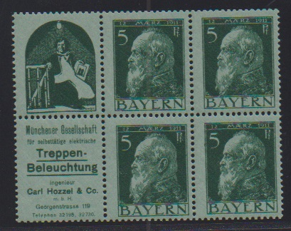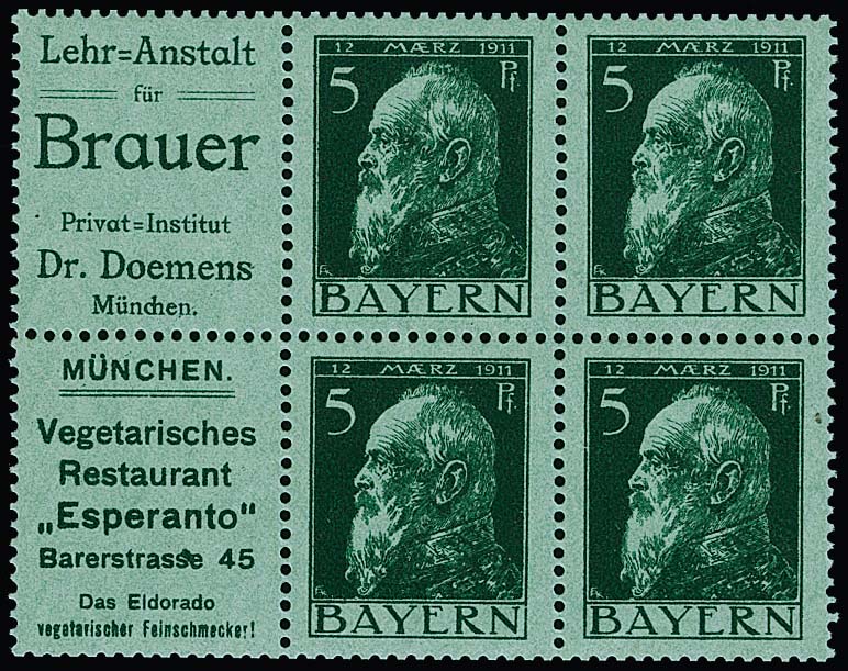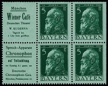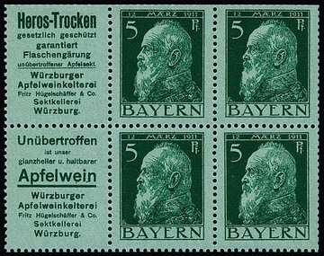 5 Pfg. Luitpold, waagerechter Reklame-Zusammendruck W1.55 ("Stift-Krawatten") gestempelt innerhalb eines Viererblocks, Mi. 400,- +