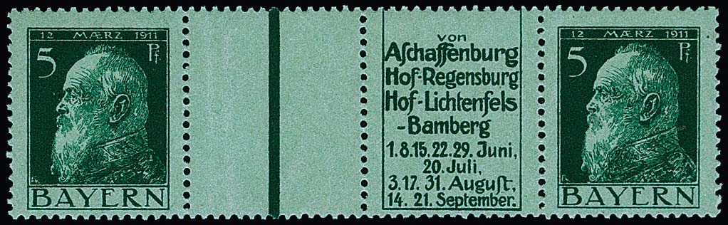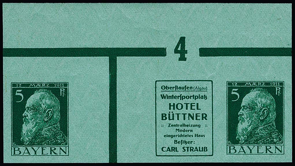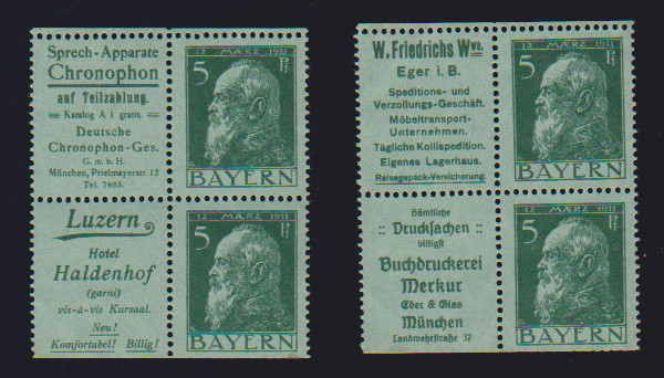 5 Pfg. Luitpold, waagerechte Reklame-Zusammendrucke W1.55 ("Stift-Krawatten", aus der Bogenecke) und W1.56 ("Hotel Büttner") je postfrisch, Mi. 1000,-
