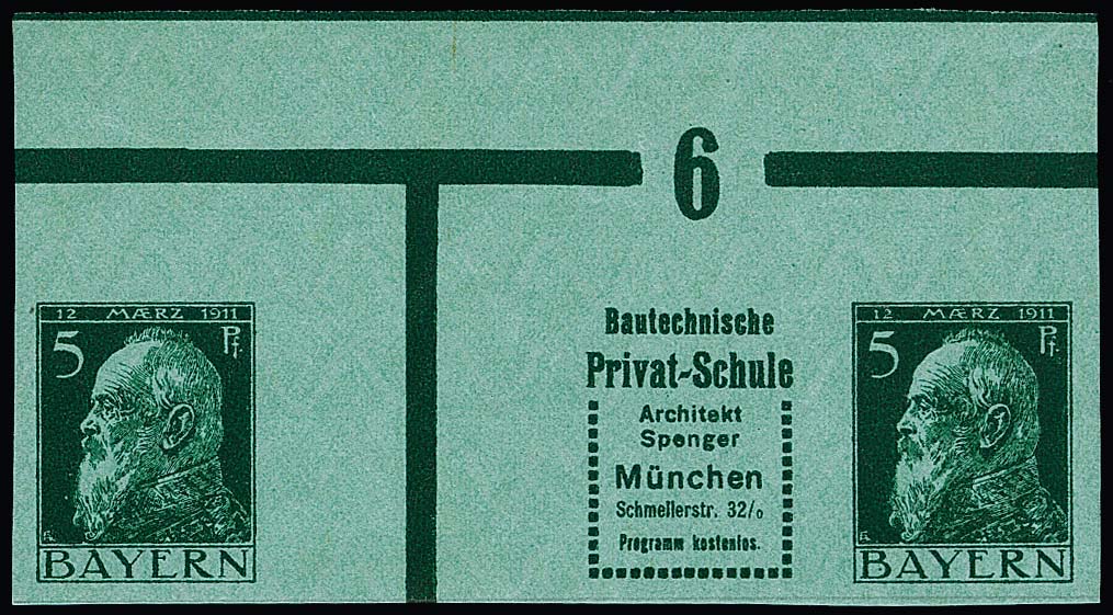 5 Pfg. Luitpold, waagerechter Reklame-Zwischensteg-Zusammendruck WZ1.20 ("Privat-Schule") in der guten geschnittenen Variante postfrisch vom Oberrand mit Walzen-Nr. "6", Michel ohne Bewertung, Fotoexp. Helbig