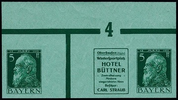 5 Pfg. Luitpold, waagerechter Reklame-Zwischensteg-Zusammendruck WZ1.59 ("Hotel Büttner") in der seltenen geschnittenen Variante postfrisch vom Oberrand mit Walzennummer "6", Michel nicht gelistet (analog ca. 4000,-)