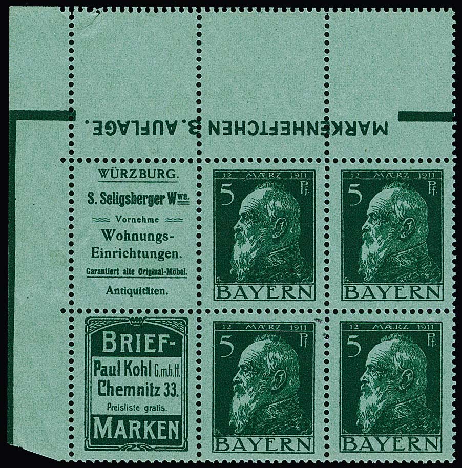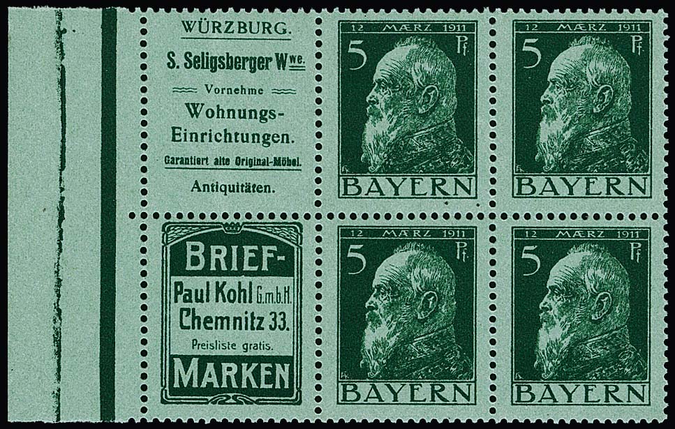 5 Pfg. Luitpold, Heftchenblatt 2.15 (Reklamen "Seligsberger" und "Briefmarken Kohl") postfrisch, Mi. etwa 300,-