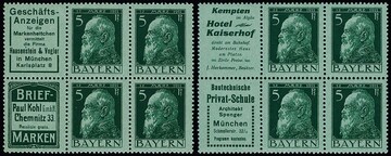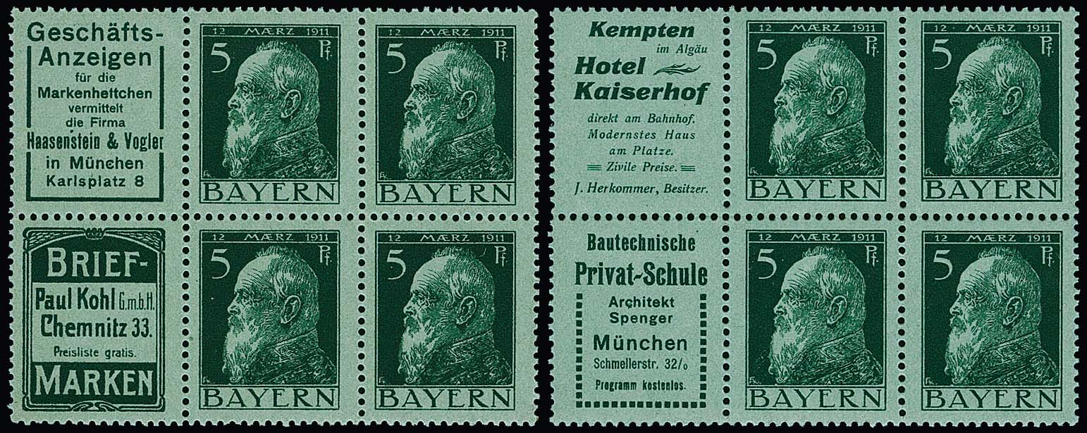 5 Pfg. Luitpold, Heftchenblätter 3.5 (Reklame "Briefmarken Kohl") und 3.11 ("Privat-Schule") je postfrisch, Mi. etwa 380,-