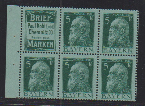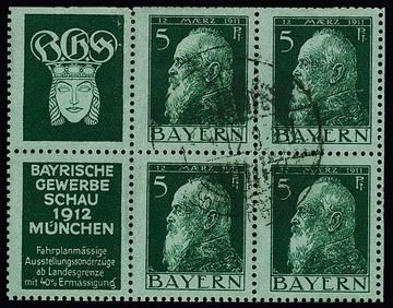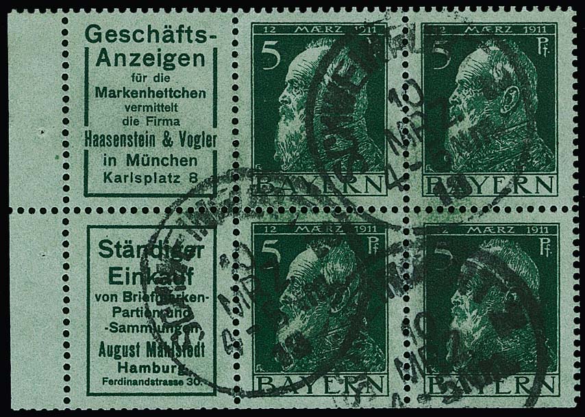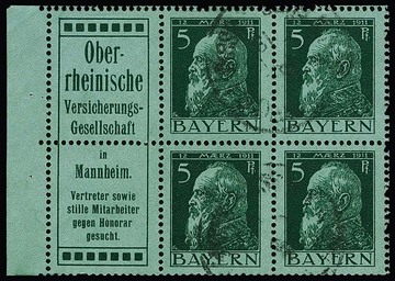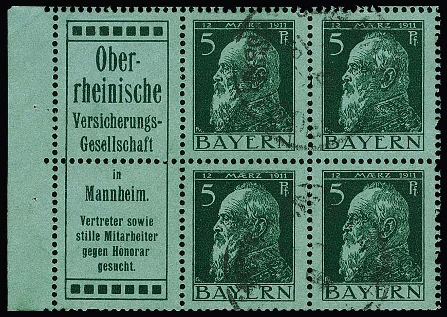 5 Pfg. Luitpold, Heftchenblatt 2.27 (Reklame "Oberrheinische Versicherung in Mannheim") gestempelt, rechte Reihe gering angetrennt. Mi. 400,-