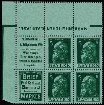 5 Pfg. Luitpold, Heftchenblatt 2.15 (Reklamen "Seligsberger" und "Briefmarken Kohl") ungebraucht aus der Bogenecke mit Randinschrift "Markenheftchen 3. Auflage", selten!
