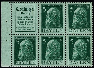 5 Pfg. Luitpold, Heftchenblatt 2.9 (Reklamen "Friedrichs" und "Buchdruckerei Merkur") ungebraucht, nahezu postfrisch (ohne Rand) sowie mit Rand gestempelt (selten!), Mi. 870,-