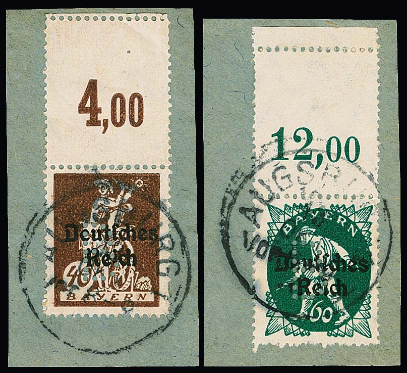 Portofreiheitsmarken, Lochung "B", fünf schön gestempelte Kabinett-Randstücke auf Briefstücken, sign. Helbig. Mi. 1030,-