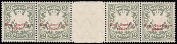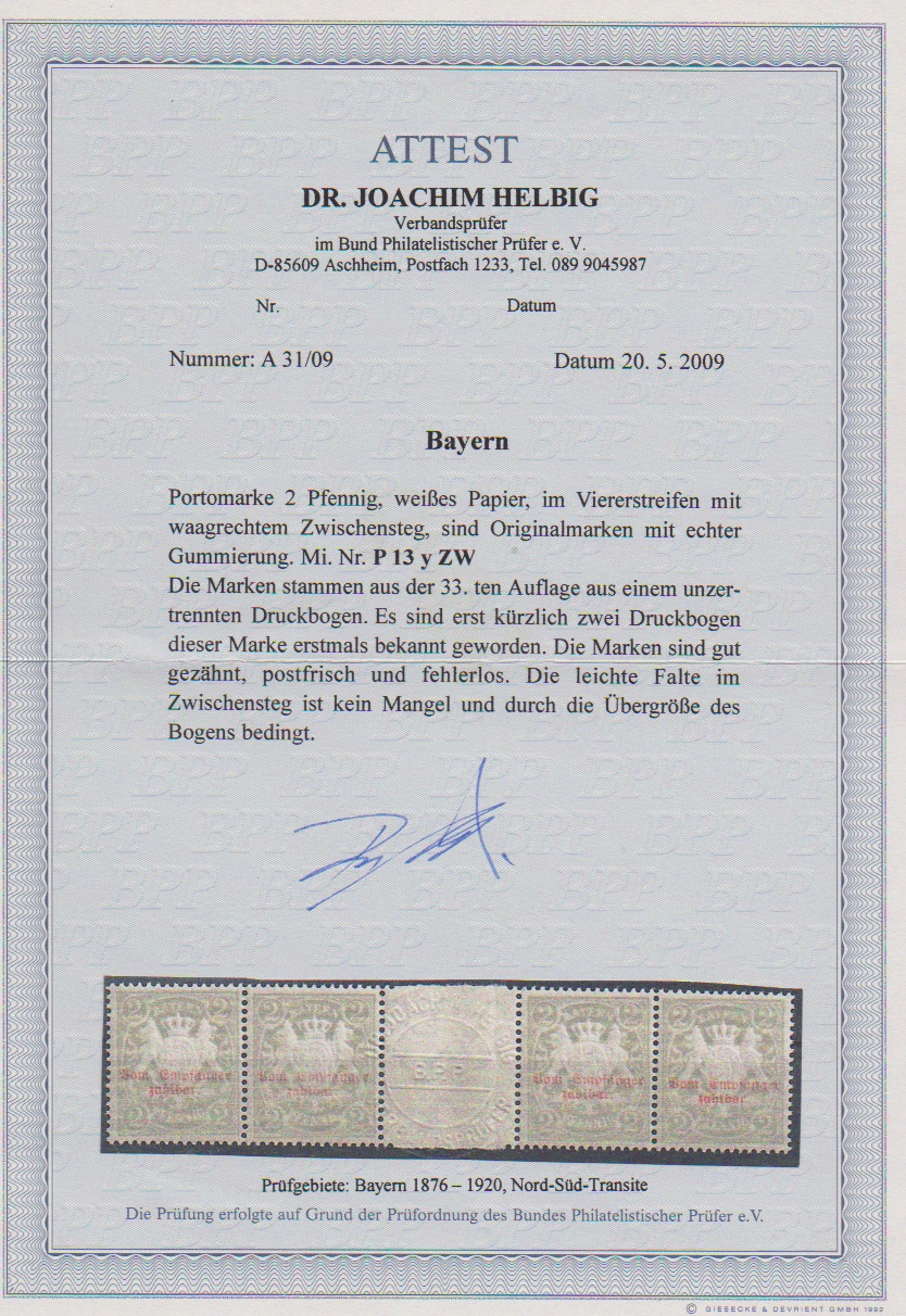 Portomarke 2 Pfg. grau im waagerechten postfrischen Zwischenstegpaar (typische Vorfaltspur im Steg = kein Mangel), nur wenige waagerechte Zwischenstegpaare bekannt, Attest Helbig. Mi. 1000,-