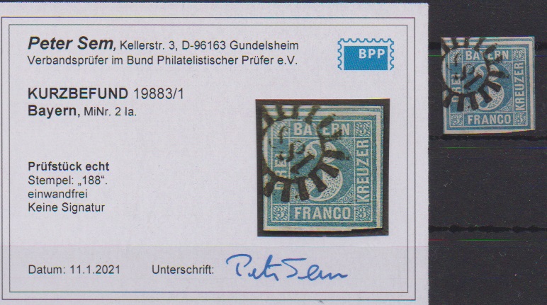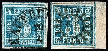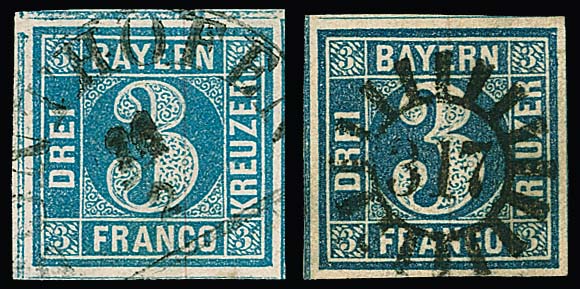 3 Kr. hell- und dunkelblau, je Platte I, zwei breitrandige Kabinett-/Luxusstücke, letzteres zentrischer gMR "317", sign. Schmitt bzw. Sem. Mi. 300,- +