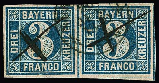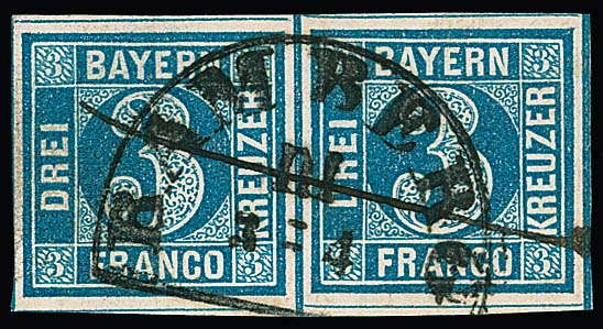 3 Kr. blau, Platte I, breitrandiges Paar (unten Bugspur) mit HK "Bamberg" und Federzug, Fotoexp. Brettl. Mi. 500,-