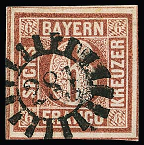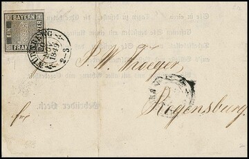 1 Kr. grauschwarz, allseits breitrandig, auf gef. Drucksache mit klarem K2 "Nürnberg 20. Nov. 1849" nach Regensburg. Die Marke mit fast vollständig abgeschwächtem Federkreuz und in der Durchsicht dünne Stellen. Seltenes Ganzstück aus dem ersten Verwendungsmonat von guter Optik. Atteste Stegmüller und Nussbaum