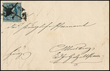 3 Kr. dunkelblau, breitrandig, auf Prachtbrief mit HK "Neuenmarkt" und kräftigem Federkreuz. Fotoexp. Sem "einwandfrei". Mi. 400,-