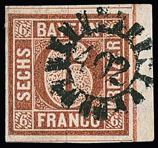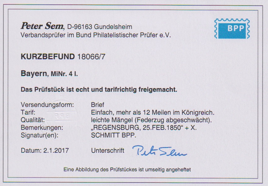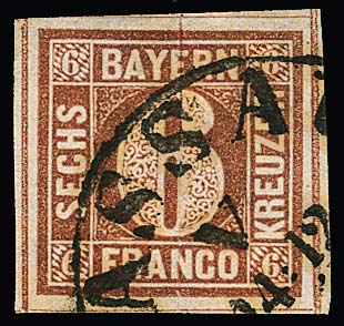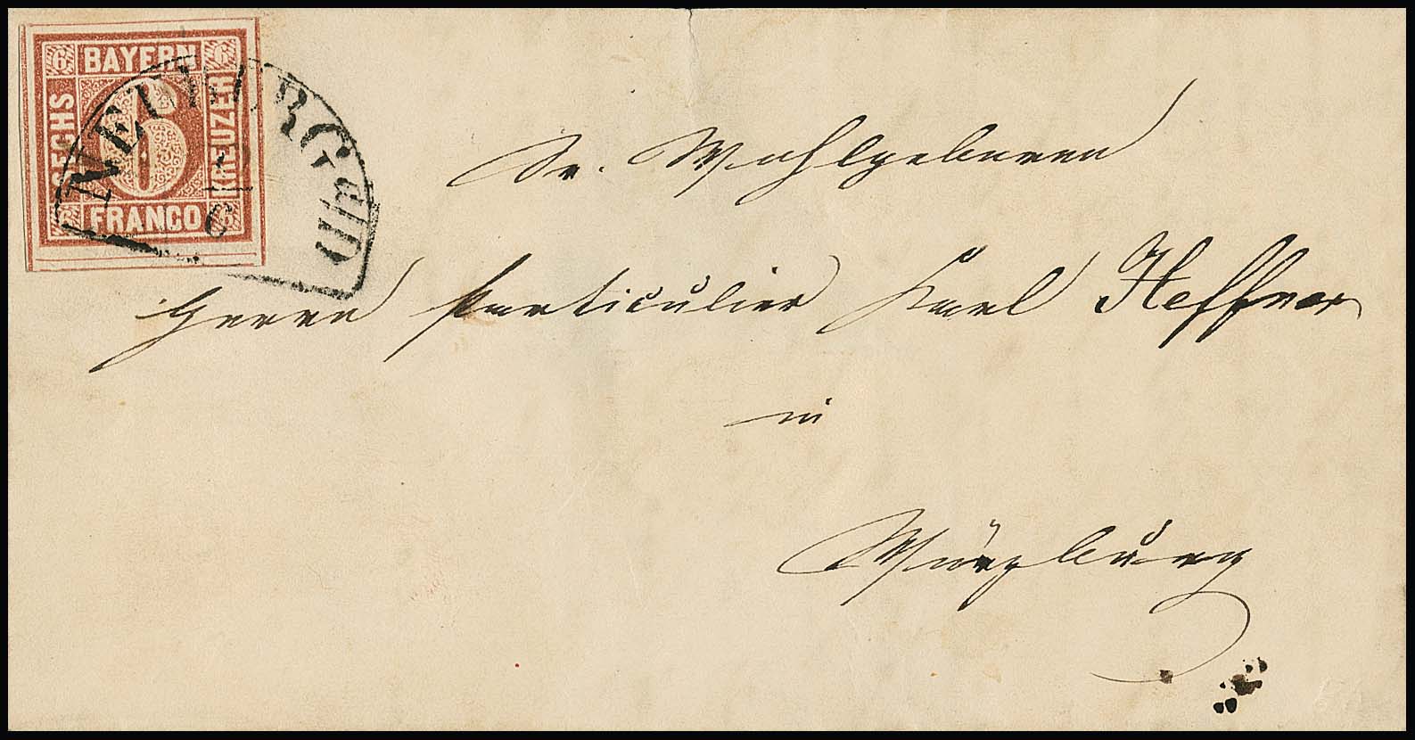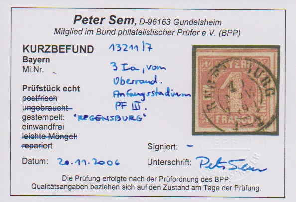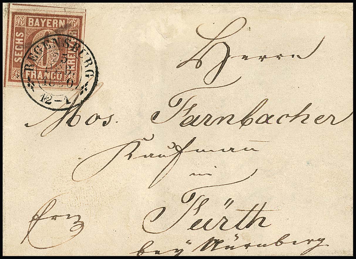 6 Kr. braun, Type I, sehr breitrandig (vier Schnittlinien, oben Nebenmarke) auf Briefchen mit K2 "Regensburg" und abgeschwächtem Federzug. Sign. Schmitt und Fotoexp. Sem