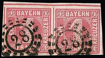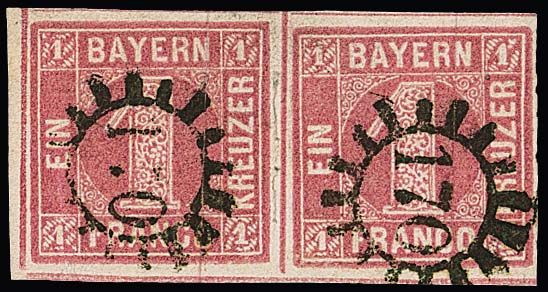 1 Kr. dunkelrosa, Kabinettpaar aus der linken unteren Bogenecke mit gMR "170", typ. "Bayern-Bruch" nur im Zwischenraum, sign. Pfenninger und Fotoexp. Sem. Mi. 250,-