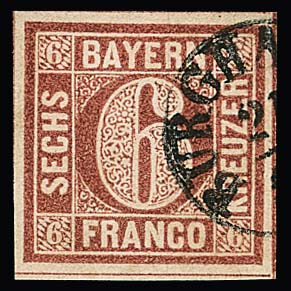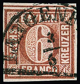 6 Kr. rotbraun, Type I, breitrandiges Kabinettstück mit Fingerhut-K1 "Burghausen", Fotoexp. Stegmüller. Mi. 300,- +