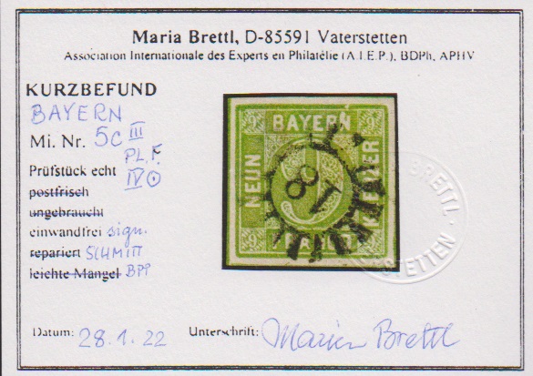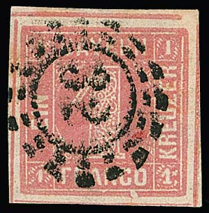 1 Kr. dunkelrosa, breitrandiges Luxusstück vom Oberrand mit zentrischem K2 "Regensburg" und Plattenfehler III im Frühstadium, sowie Kabinettstück 9 Kr. maigrün mit Plattenfehler IV. Fotoexp. Sem bzw. Brettl