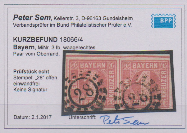1 Kr. dunkelrosa, Kabinettpaar vom Oberrand mit oMR "28", Fotoexp. Sem. Mi. 250,-