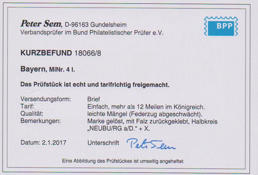 6 Kr. braun, Type I, sehr breitrandig, vier volle Schnittlinien und unten Nebenmarke, mit Falz auf zugehörigem Briefchen mit HK "Neuburg a.D." und etwas abgeschwächtem Federzug, Fotoexp. Sem