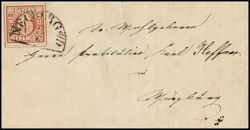 1 Kr. rosa (mit breitem linkem Bogenrand, idealer Ra2 "München", Briefpapier kl. Fehlstelle, gut sign. Sem), sowie 1 Kr. dunkelrosa aus Nürnberg, je Kabinettstücke auf zwei Ortsbriefen, letzterer mit der Besonderheit als Forwardedbrief aus Triest 1855 (mit Inhalt und vs. Absenderstempel)