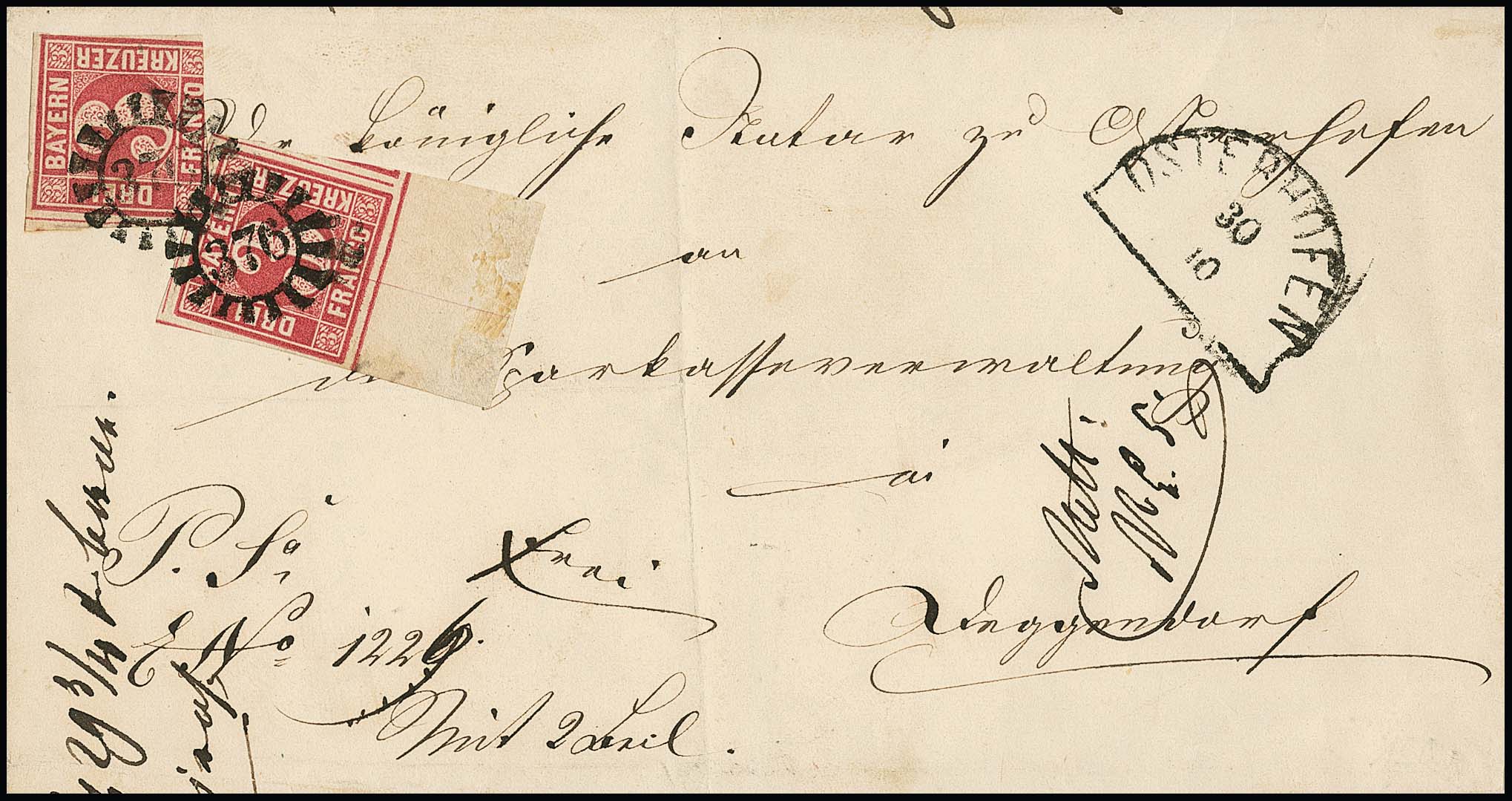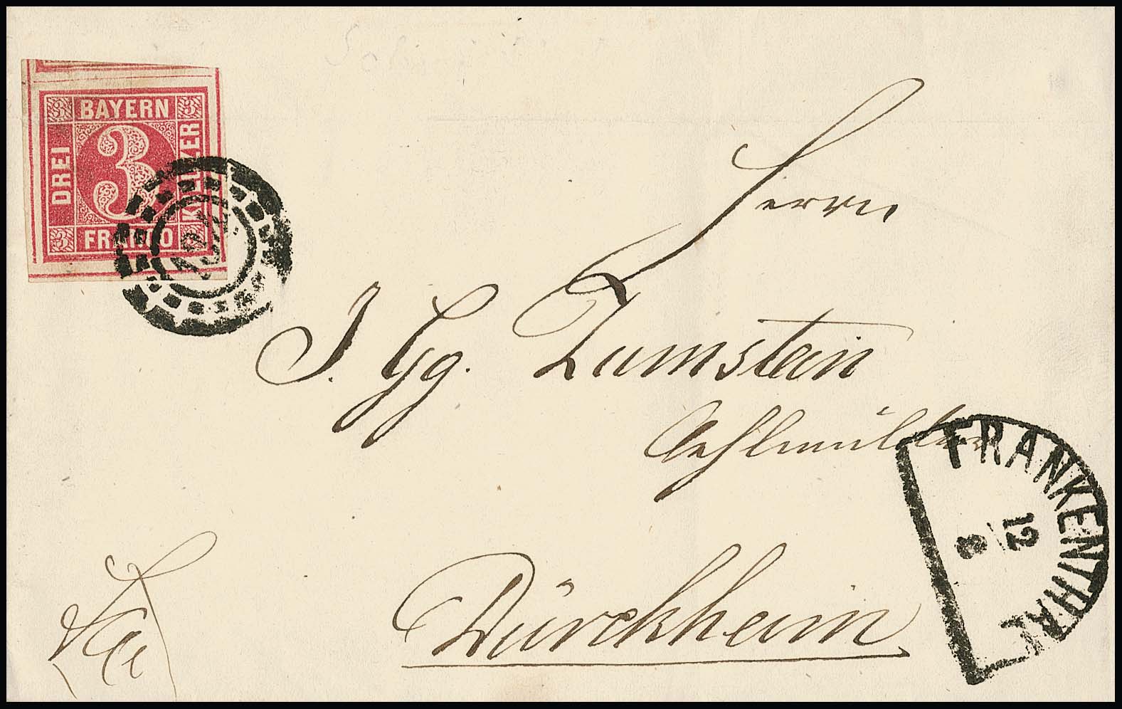 3 Kr. rosakarmin, vier freiliegende Schnittlinien (oben Nebenmarke), ein bemerkenswerter Randriese mit oMR "134" und HK "Frankenthal" auf Luxusbrief nach Dürckheim