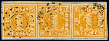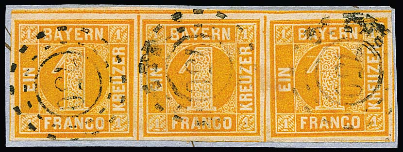 1 Kr. gelborange, allseits sehr breitrandiger senkrechter Kabinett-Dreierstreifen mit gMR "150" (Gefrees), sign. Schmitt. Mi. 250,-