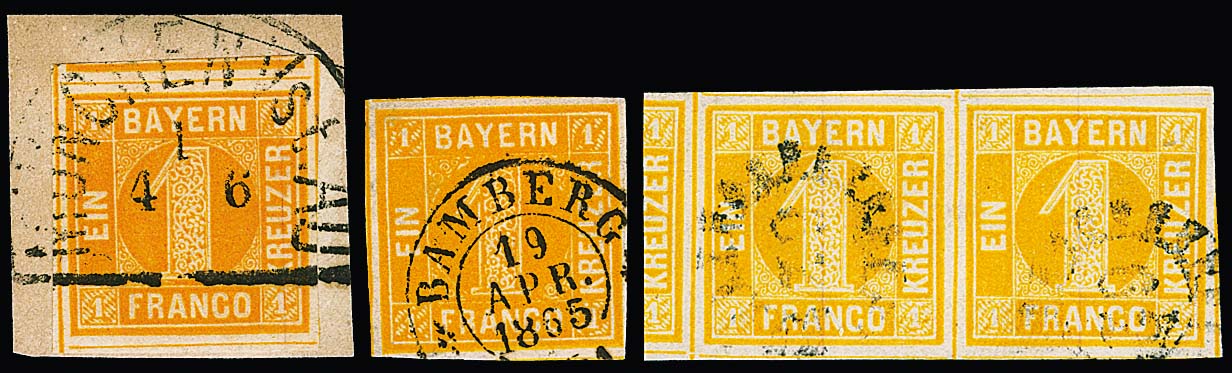 1 Kr. gelborange, je Kabinettpaar und Kabinett-Dreierstreifen, sowie weiterer Dreierstreifen mit breitem rechtem Rand und "Duplex"-Entwertung, jedoch Randmarke kleine Mängel, alle sign. Sem. Mi. 660,-, dazu senkrechtes Paar Nr. 8IA ("ausgefüllte Ecken", kl. Mgl.), im Michel nicht gelistet (Fotoexp. Sem)