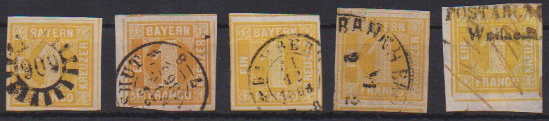 1 Kr. gelborange, neun ausgesuchte Exemplare (lediglich eine größere linke untere Bogenecke mit Postablage-L2 und zusätzlich Federzügen), u.a. Schnittriesen (auch auf Luxusbriefstück), sowie ein Paar, dabei linke Marke mit drei abgeschrägten Ecken, sign. Schmitt u.a.