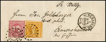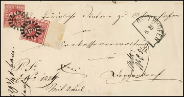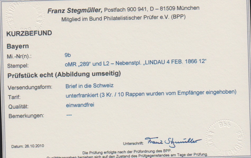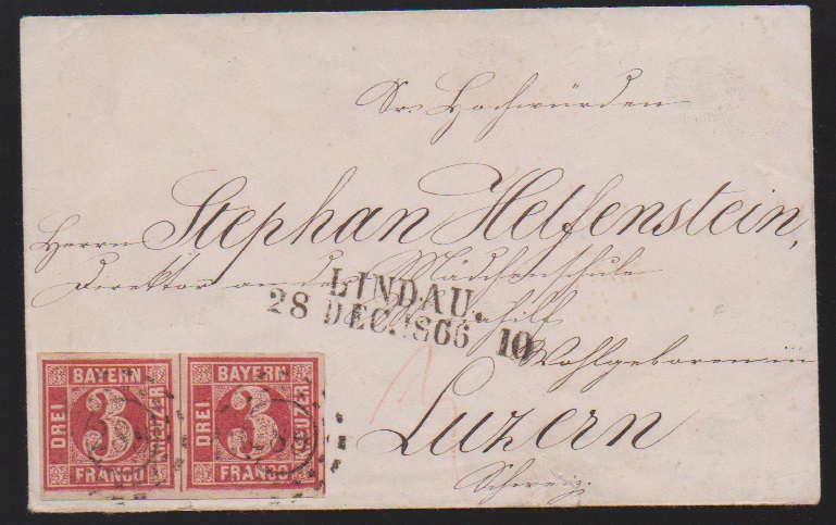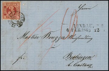 3 Kr. karmin, Einzelstück bzw. Paar, mit oMR "289" und L2 "Lindau" auf zwei Prachtbriefen nach Berlingen bzw. Luzern/Schweiz, sign. Sem bzw. Fotoexp. Stegmüller für die nachtaxierte Einzelfrankatur