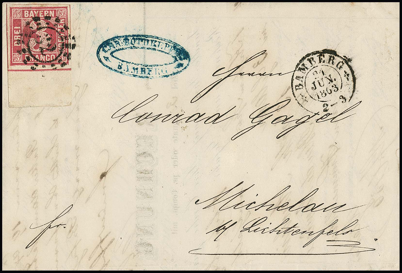 3 Kr. rosa, vier Schnittlinien und unten 13mm breiter Bogenrand, links Plattenfehler im Rand, auf Kabinettbrief mit oMR "32" und K2 "Bamberg" nach Michelau