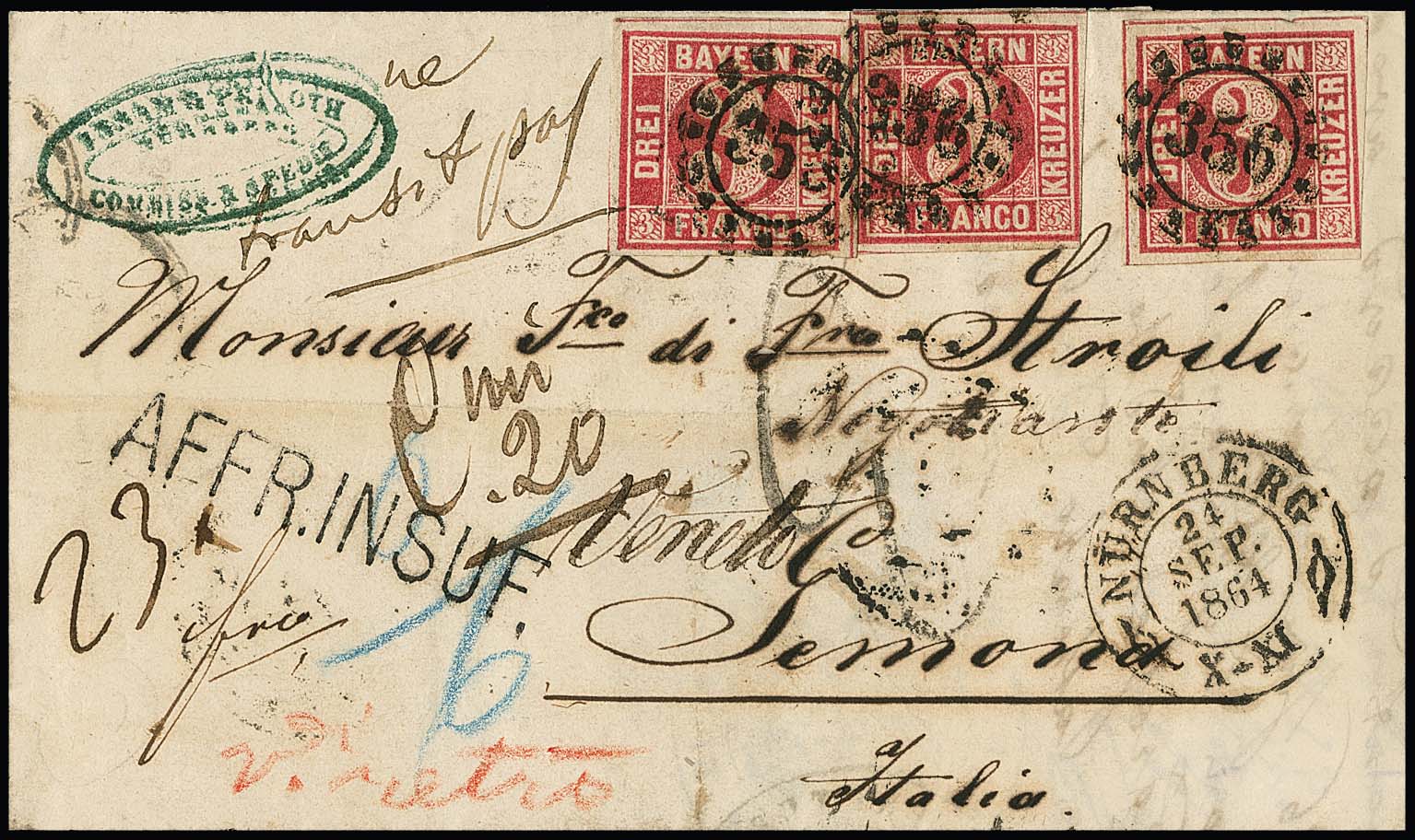 3 Kr. rosa per drei (einmal knapp) auf unterfrankiertem und nachtax. Brief mit oMR "356" und K2 "Nürnberg" 1864 nach Italien, hs. "23x" und L1 "Insuff.", rs. neun Stempel