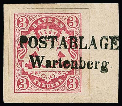 1 Kr. blaugrün (idealer oMR "769"), 3 Kr. rosa (idealer Zier-K1 "Türkheim"), 12 Kr. purpur (Luxusbriefstück mit K1 "Würzburg Stadt"), sowie 6 Kr. braun vom linken Rand, vier ausgesuchte Kabinett-/Luxusstücke, teils sign. Brettl bzw. Sem