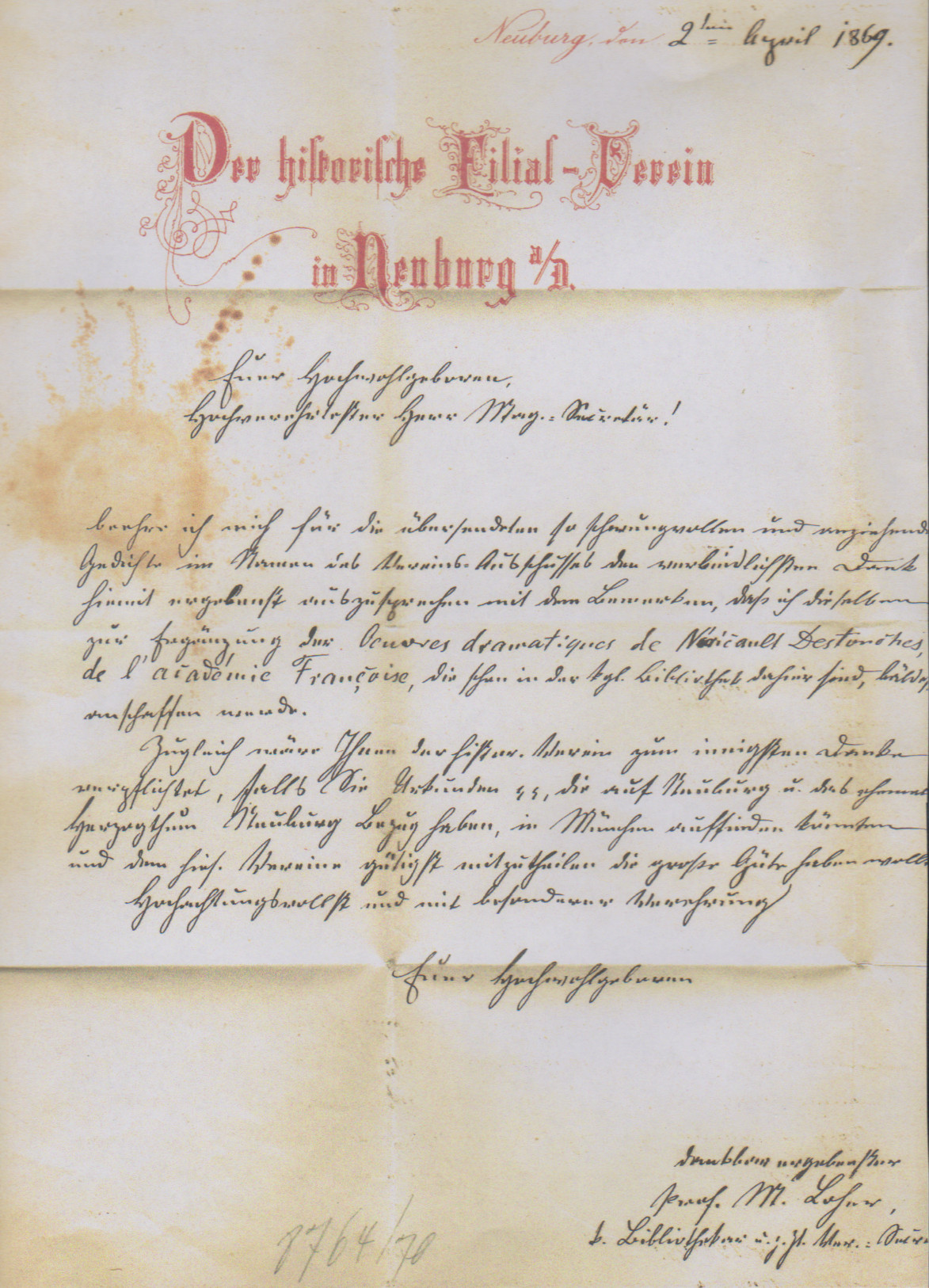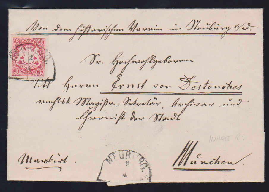 3 Kr. rosa auf frischem Luxus-Adelsbrief mit HK "Neuburg a.D.", vom historischen Verein mit dekor. rot gedrucktem Briefbogen