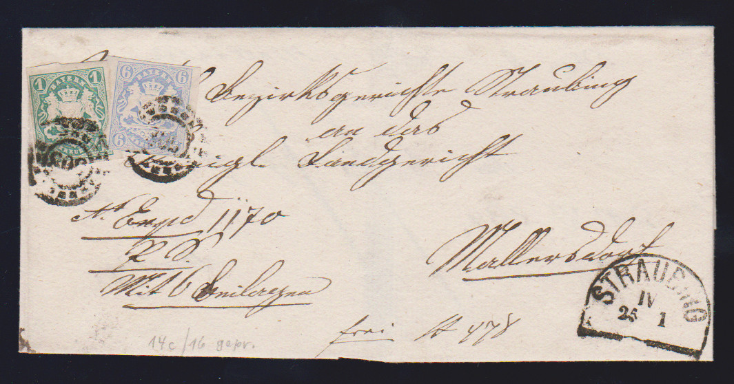 1 Kr. dunkelblaugrün und 6 Kr. hellblau auf Prachtbrief mit oMR "508" und HK "Straubing" nach Mellrichstadt, sign. Schmitt