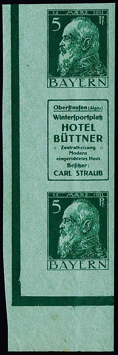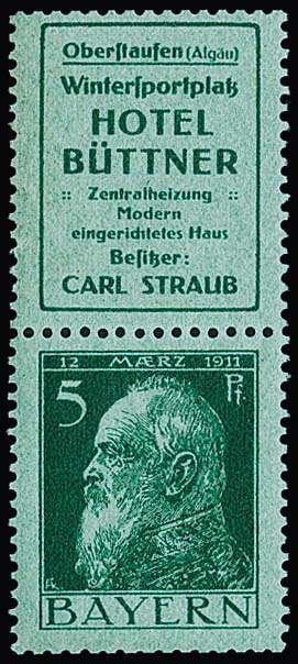 5 Pfg. Luitpold, senkrechter Reklame-Zusammendruck S1.9 ("Hotel Büttner") postfrisch, Mi. 700,-