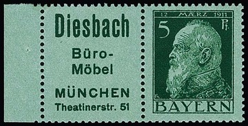 5 Pfg. Luitpold, Reklame-Zusammendruck "Briefmarken Kohl" gestempelt, Mi. 100,-