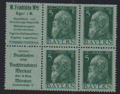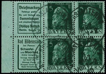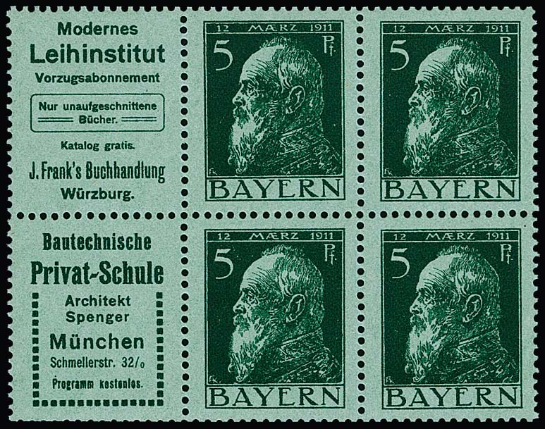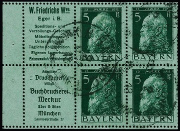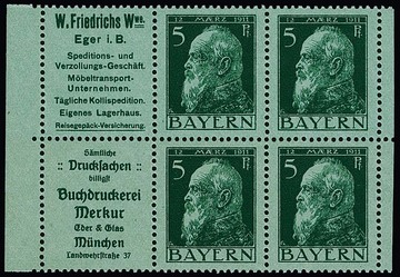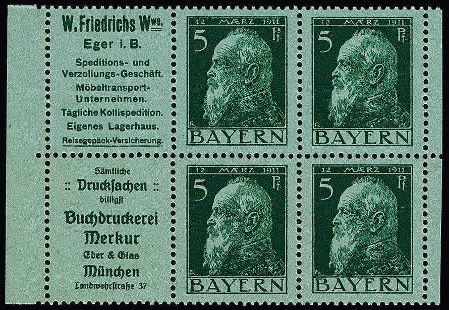 5 Pfg. Luitpold, Heftchenblatt 2.9 (Reklamen "Friedrichs" und "Buchdruckerei Merkur") ungebraucht, nahezu postfrisch (ohne Rand) sowie mit Rand gestempelt (selten!), Mi. 870,-