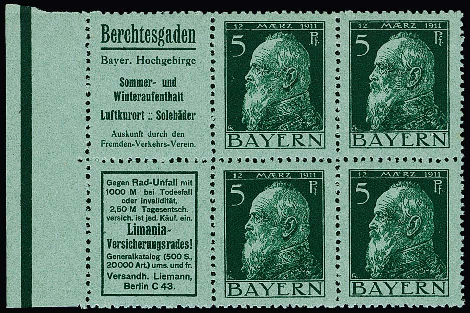 5 Pfg. Luitpold, Heftchenblatt 2.11 (Reklamen "Berchtesgaden" und "Limania-Versicherungen") ungebraucht (fast postfrisch), Mi. 380,-