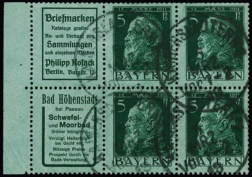 5 Pfg. Luitpold, Heftchenblatt 2.14 (Reklamen "Philipp Kosack" und "Bad Höhenstadt") gestempelt, Mi. 700,-