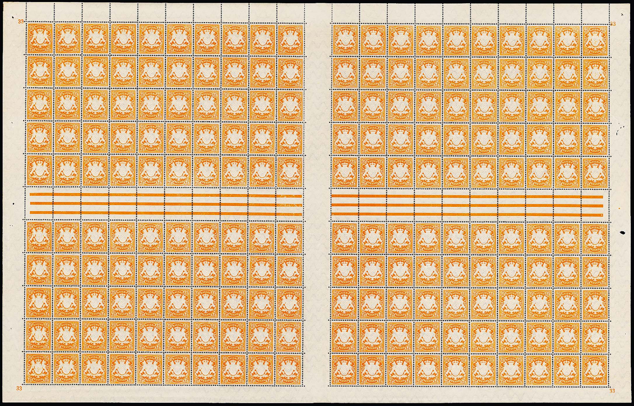 25 Pfg. orange im vollständigen unzertrennten Druckbogen von 200 Exemplaren, mit vier Plattennummern, einem Herzstück, 18 senkrechten und acht waagerechten Zwischenstegpaaren. Es handelt sich u.W. um den einzigen noch existierenden vollständigen Druckbogen dieser Marke!