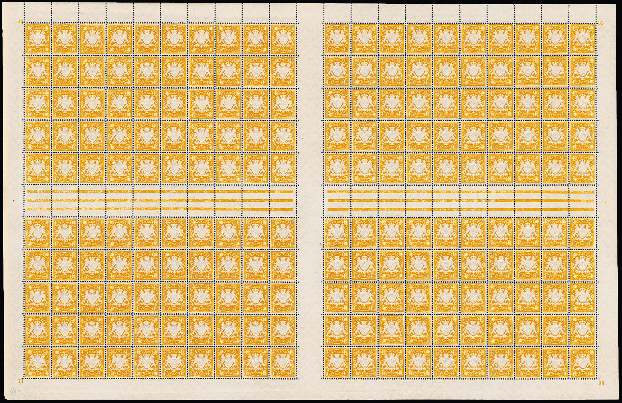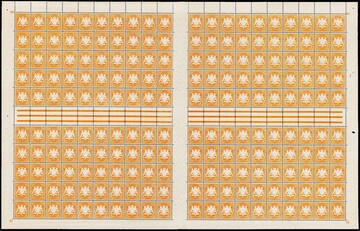 40 Pfg. orangegelb im vollständigen unzertrennten Druckbogen von 200 Exemplaren, mit vier Plattennummern, einem Herzstück, 18 senkrechten und acht waagerechten Zwischenstegpaaren. Es handelt sich u.W. um den einzigen noch existierenden vollständigen Druckbogen dieser Marke!