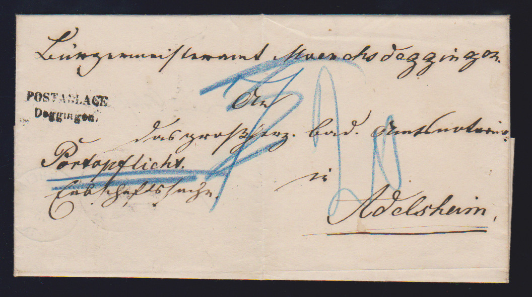 "Deggingen", 1875, Postablage-L2 klar auf nachtaxiertem Brief ("7" bzw. "20") nach Adelsheim