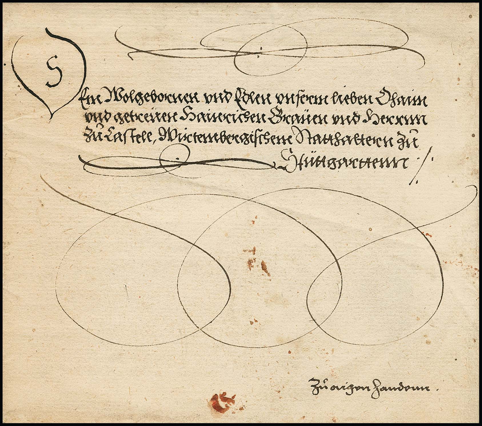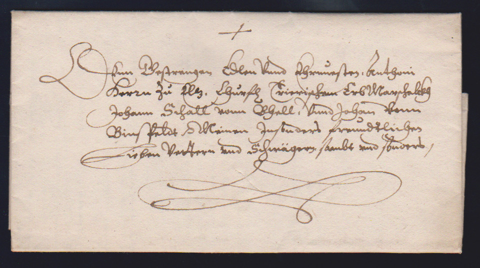 "Ansbach", 1572 ("Onolzbach"), früher Schnörkelbrief mit kpl. Inhalt, Briefkopf "von Gottes Gnaden Georg Fridericus Marggraf zu Brandenburg" (1539-1603) und eigenhändige Unterschrift, an den Grafen zu Castell in Stuttgart "zu eigen Handen"