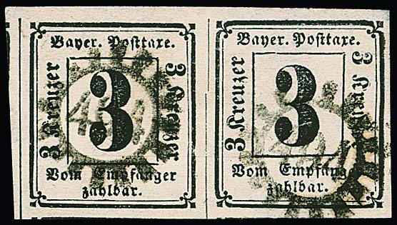 Portomarke 3 Kr. schwarz, waagerechtes breitrandiges Luxuspaar mit klarem gMR "494" (Stadtamhof), in dieser besonders schönen Erhaltung eine seltene Einheit, Attest Brettl. Mi. 1500,- +