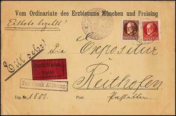 10 u. 50 Pfg. Ludwig auf Land-Expreßbrief von München 1916 nach Reithofen im Landbezirk von Pastetten. Als Ordinariatssache des Erzbistum gemäß Ra1 "Frei durch Ablösung" portofrei und nur die Gebühr für Expreß-Landzustellung durch Briefmarken frankiert, so gerade von Bayern sehr selten!