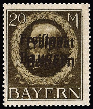 20 Mk. "Freistaat Bayern", Abart "doppelter Aufdruck", tadellos postfrisches Exemplar in perfekter Zähnung. Der Doppelaufdruck ist besonders deutlich sichtbar. Eine große Bayern-Rarität, von der lediglich ein einziger Bogen zu 20 Marken bekannt wurde. Bei Michel nur mit "-.-" notiert, Fotoattest Bauer ("... lag bislang nur ein Bogen mit 20 Marken mit doppeltem Aufdruck "Freistaat Bayern" vor".)