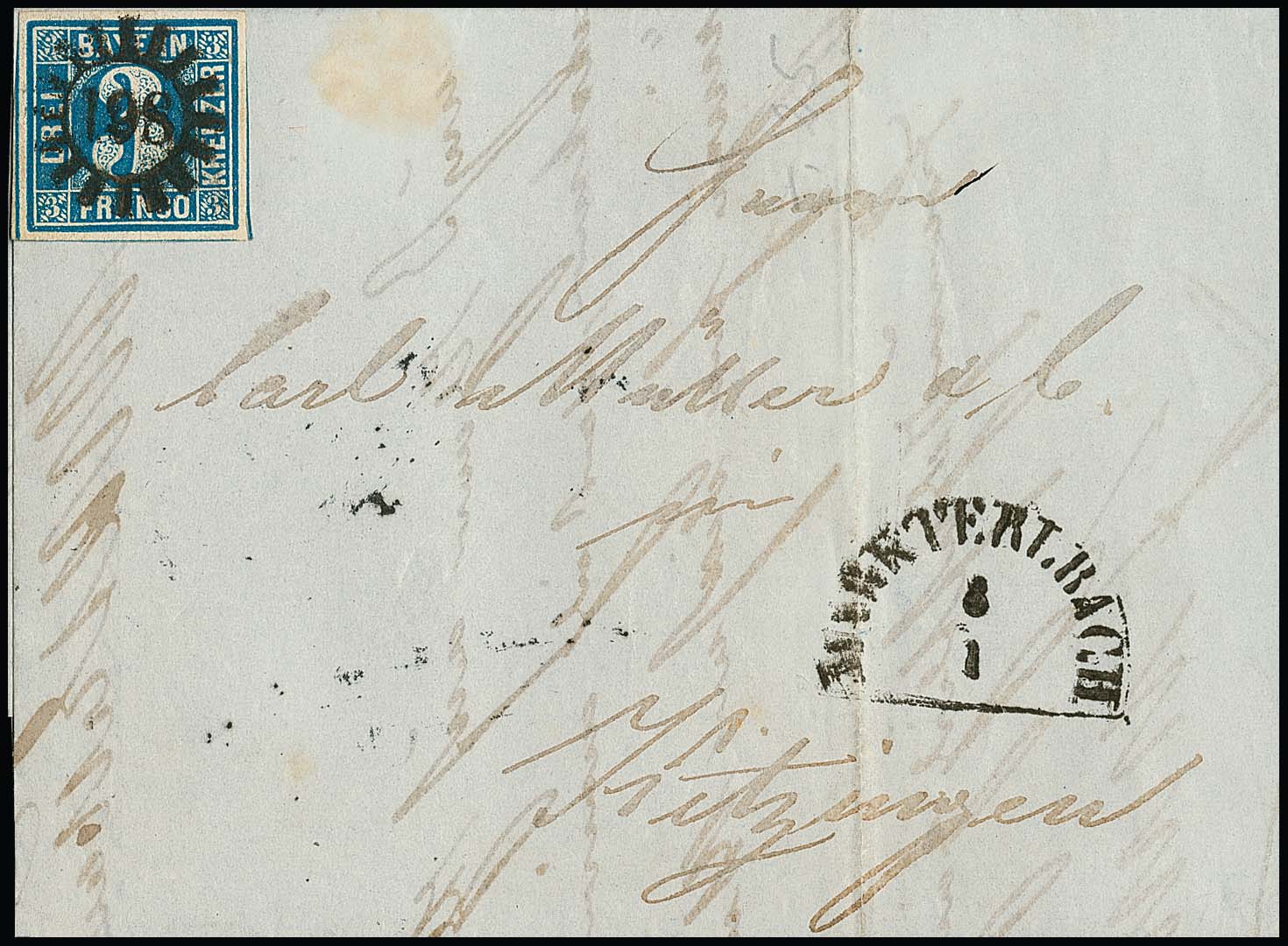 "198", zentrischer gMR nebst HK "Markt-Erlbach" auf Faltbrief (kl. Fleckchen nur im Briefpapier) mit 3 Kr. blau